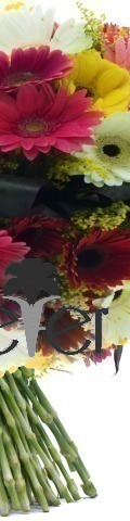 Designed to showcase the natural beauty of the Gerbera, one of nature's most delightful daisies. The Simply Gerberas arrangement is perfect for celebrating life's most memorable occasions. It includes 18 assorted colour gerberas, sunny yellow solidago and a selection of palm leaves which provide the perfect foundation for this colourful floral display.