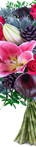 6 Pink Roses, 4 Pink Lilies, 2 Purple Calla Lilies, Eryngiums, Pinecones